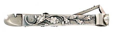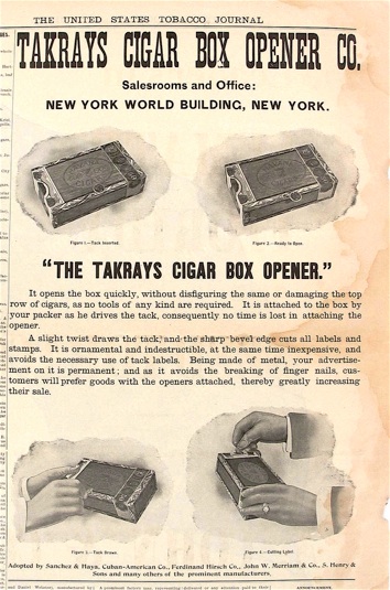 Although cigar boxes had been around since the early 1800’s, they were not widely available in consumer sizes. Pre-1860 documents suggest only one cigar in ten was purchased in or from a consumer-size box of 25, 50 or 100. All that changed in 1863 when the need for money to fight the Civil War resulted in a series of tax laws that mandated cigar boxes into universal use. Every cigar after that date had to be packed in and sold from a box. Those Civil War revenue laws required tax stamps to be wrapped around the box, and after 1868, added other labeling and the provision that those stamps must be destroyed when the box was opened. That same year, 1868, the first cigar box opener was patented.
