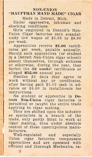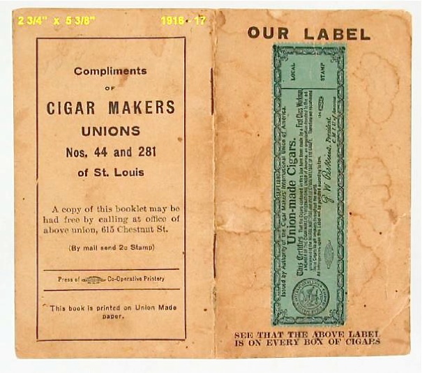 In addition to buttons, the CMIU gave away useful items by the score. This small combination notebook and mini-almanac is a good example of Union message and strategy. It’s small enough to fit in an overall pocket, and contains useful information to encourage carrying it there. 1917 and 18 calendars, blank pages, and a list of Union and non-Union brands make up the most of the balance. Prominent on pages 2 and 3 is a plea against patronizing a local Detroit cigar brand.