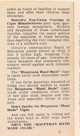 Ever since the passage of the Pure Food and Drug Act in 1906 the nation had a heightened awareness of sanitation. Although lobbyists had successfully removed tobacco from the list of regulated products, cleanliness had been an issue in the cigar industry since the last quarter of the 19th century, thanks to the serious campaign against tenement house cigar factories conducted by the government, a rising star NY politician named Theodore Roosevelt, and the Cigar Maker’s Union. Sanitation and child labor became cornerstones of the Union early, and continued into the machine age and the Union’s inevitable decline and demise.