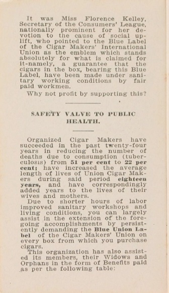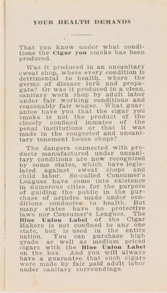 The CigarMaker’s International Union was an aggressive fighter for worker’s rights. Though losing most strikes, they were able to pioneer union staples such as traveling loans, regulated workdays, sick benefits and other innovations. More successful was their focus on their “Blue Label,” which in September 1880 became the nation’s first national Union stamp. The Union tightly regulated who could use it, but repeatedly urged those who could to place it on every box of cigars made in union shops. The Union invested in pins, buttons, and a wide range of other give-aways calling attention to the Union Label, urging members of all trade unions to honor the label by purchasing cigars only from boxes that displayed it.