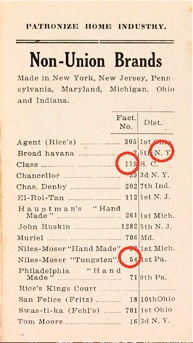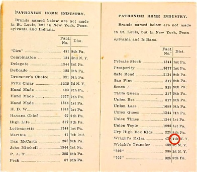 RIGHT: pages listing popular brands sold in St. Louis but made in NY, NJ, MI, OH, PA and IN. Circles highlight errors or typos resulting in wrong states, tax districts or factory numbers.