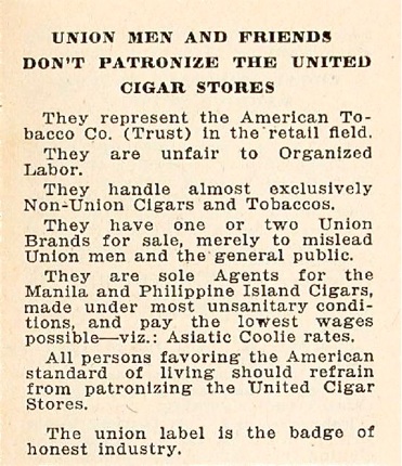In the 1800’s, the Union’s chief enemy was tenement house factories employing women and children working under appalling conditions in their flats. Their next crusade was against the Tobacco Trust. Unlike the tenements which were a primarily a New York City problem, the Trust impacted Union members around the country. Many of the celluloid give-aways seen in another Museum exhibit reflect the vigor and direction of that campaign. With the Trust’s break-up in 1911, the chain stores, especially United Cigar Stores, the retail arm of the technically dissolved trust, became a prime concern. They had good reason to fear United Cigar with its endless premiums and price-cutting, thousands of stores stocked with a variety of related notions, situated in prime urban locations, usually on corners of busy streets.