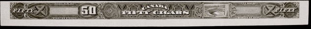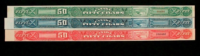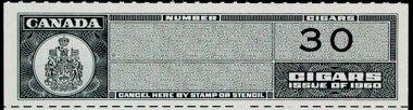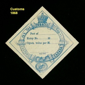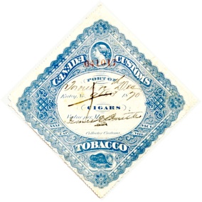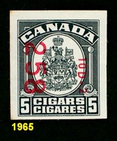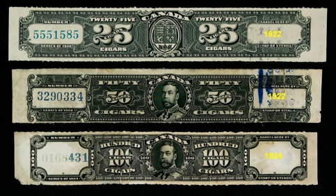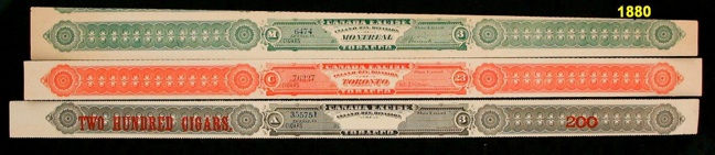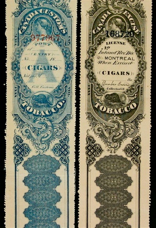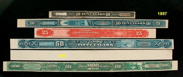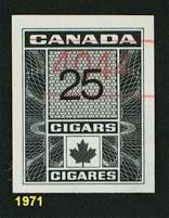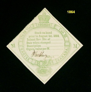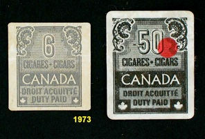 Canadian cigar stamps first appear in 1864 and were used until 1974, when Canada became the last country to quit using tax stamps on packages of cigars.