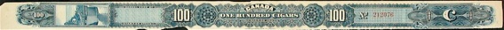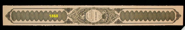 In 1885 a stamp for boxes of 10 cigars was authorized in black, blue and green, followed two years later by blue and black stamps for boxes of 3 and 6. Why a 12” stamp was needed for a pack of 3 cigars and a 15” long stamp for a pack of 6 cigars is not clear.