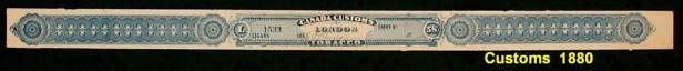 In 1881, a new design was created. Stamps were issued blank as well as imprinted with the I.R.D. in which taxes were paid. Different rates were charged based on the origin of the tobacco used, the color of the stamps indicating the tax and tobacco origin. Green indicated cigars made of all domestic tobacco, black was used for cigars made in Canada of imported tobacco. Between 1881 and 1883 red stamps were used on cigars going into bonded warehouses with duty unpaid. Blue remained the color for imported cigars, but the stamp had a slightly different design, including the words “Canada Customs” in an arc. This is the last Canadian stamp marked specifically as a Customs stamp.