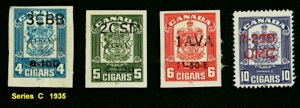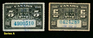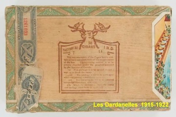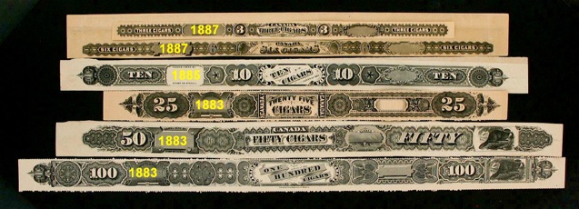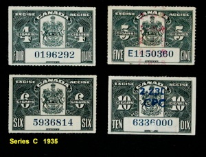 The Canadian excise tax stamp issues of 1883, 1897, 1915, 1922 and Series C (used 1935-1960) are those most likely to be found on Canadian cigar boxes. Stamps do not absolutely date Canadian boxes because cigar makers were allowed to continue using up stock-on-hand after new stamps were issued, often forestalling the printing of some denominations for many years after the laws changed.