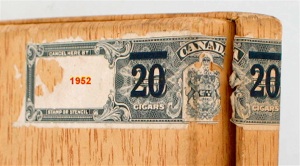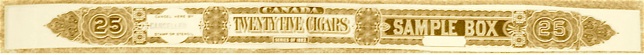 Canadian handling of sample boxes was very different than in the United States. Starting in 1883, Canadian cigar manufacturers were allowed to have two types of open sample boxes in their factory: duty-paid and duty-unpaid. A cigar maker was permitted only one open untaxed sample box of 25 cigars from each brand he produced. These boxes were for display purposes only and were to be affixed with a special yellow excise stamp to identify them. These display cigars could not be smoked.