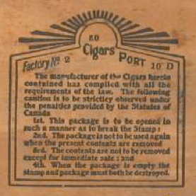 After 1921, IRD’s were renamed “Ports” and a new system developed. Each province was assigned a letter from east to west. A was assigned to Nova Scotia, B to Prince Edward Island, C to New Brunswick, D to Quebec, E to Ontario, F to Manitoba, G to Saskatchewan, H to Alberta and I to British Columbia. Within each province numbers were assigned to cigar making centers as well as factory numbers to individual makers. Within the province of Quebec, for example, 10D was Montreal whereas 13D was Quebec. After 1921, the ID on a box of 50 cigars made in Montreal by S.Davis & Sons would read Fact. 6, Port 10D, 50.