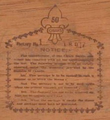 The Canadian Inland Revenue Act of 1880 contained no requirement for a Caution Notice or ID similar to those required in the U.S. after 1868. The Act did contain strict stipulations about removing the revenue stamp and destroying boxes that had traces of a stamp. Law-abiding literalists made early Canadian boxes very scarce today.