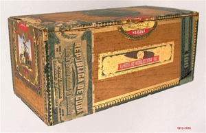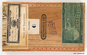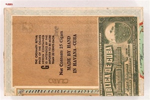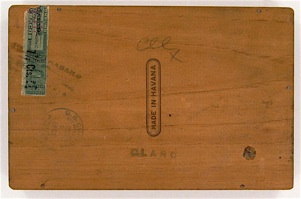 Purchased retail in Havana during Christmas vacation, 1937, this box was hand carried into port at Key West, where it was stamped by the tax inspector. The tax stamp is Cuban. No Cuban Guarantee stamp was used on boxes sold in Cuba. The oval shaped origin mark seems to have become the preferred form in the 1930’s. Almost all Cuban boxes exported during and after WWII are marked with this style oval reading MADE IN CUBA, MADE IN HAVANA, MADE IN HAVANA - CUBA or HECHO EN CUBA. [6864]
