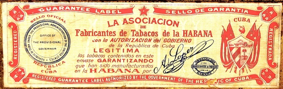 The reference to the “Office of the Provisional Governor” suggests this very rare version of the Cuban Guarantee stamp was used during the first American Occupation of Cuba 1898-1904, though possibly only on brands manufactured by the Tobacco Trust. This copied from the bottom of a La Rosa Aromatica box not in the NCM.