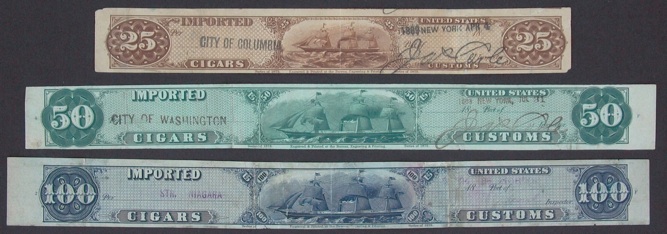 The design of the import stamp issue of 1879 didn’t change until 1904 though a minor change took place in 1895. The “18___” in the right panel was changed to space for a serial number, printed “No.___.” Also, the 50 denomination was printed in red after 1895 but other colors remain the same. The 25 was nearly 10” long and the larger denominations about 13 inches. Almost all boxes with this stamp are from Cuba and collectible.