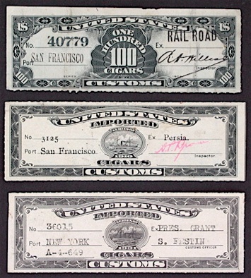 These customs stamps are called “Bonded Warehouse stamps,” are dated between 1913 and 1954, and found in a selection of sizes and interesting texts which describe the type of tobacco and the process used to make the cigars. The dates on the stamp are NOT the dates of the cigars. More detail about these is found in the exhibit of import stamps.