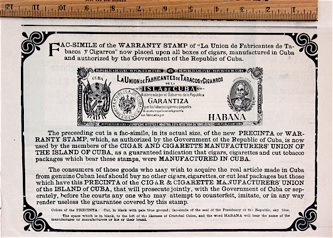 This half page ad in a 1906 TOBACO JOURNAL calls attention to the latest version of the Union Guarantee stamp, first issued in 1902 under authority of the Cuban republic. Note the addition of the Cuban seal to replace