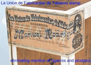 By an 1889 order of the King of Spain La Union de Fabricantes de Tobacos, an association of workers in cigar, cigarette and smoking tobacco factories, was granted the right to print a large stamp guaranteeing the Cuban origin of the contents. The earliest version of the stamp mentions cigarros y picadura (cigarettes and smoking tobacco) whereas the later version of the stamp mentions only tobacos (cigars).