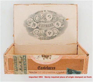 H. UPMANN box imported into San Francisco in 1893. As of the previous year most goods imported into the U.S. had to be marked as to their place of origin. Note the impromptu stamping of “Made in Havana, Cuba” on the bottom front of the box’s edging. The green import stamp confirms the pre 1895 dating.