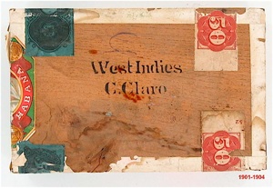 The simple West Indies origin stamp, dark blue wide 1901 tax stamp and red import stamp (1895-1904) combine to identify this LA TRAVIATA box as 1901-1904.