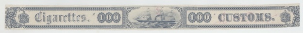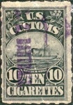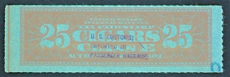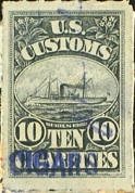 In 1879, the first cigarette customs stamps were issued for boxes of 10, 20, 50 and 100. Until 1910, when boxes containing 10 or 20 (usually expensive) Cuban cigars were imported, cigarette customs stamps from 1879 or 1903 were overprinted with the word “cigars” and the quantity (if needed). In 1910, the “All purpose” imported cigar stamp with no denomination was created, eliminating the need for cigarette stamps to be overprinted. The denominations in the two upper corners makes is easy to distinguish between issues of 1879 and 1903.