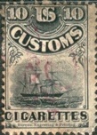 Above left to right: [1] 1879 import stamp for 10 cigarettes; [2] 1879 import stamp for 20 cigarettes; [3] 1903 import stamp for 10 cigarettes; [4] 1903 import stamp for 20 cigarettes (not available for photo) ; [5] 1903-1910 import stamp for 10 cigarettes overprinted with “CIGARS” used on a box of 10 Cuban cigars. [6] 1879 cigarette customs stamp for a box of 100.