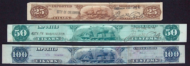 The imported cigar stamp of 1873 is the first to have denominations, reflecting changes in tax laws. The design of 1873 and 1875 is identical except Harrison replaced Grant in 1875. Color changes on the 25’s but 50’s and 100’s from 73 and 75 are the same color. The 25’s are approximately 10” long, the 50 and 100 nearly 15 inches. All import issues