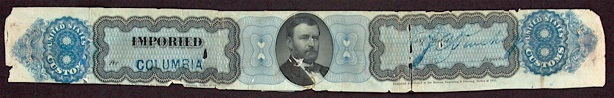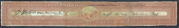 The first official “imported cigars” stamp listed in Springer’s Stamp Catalogs is the issue of 1866, but this 1864 sticker/stamp found pasted on a box from that period proves that earlier ones existed.