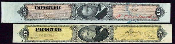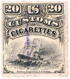 Below top to bottom: Cigarette stamps from 1879 and 1883 found on boxes of small domestic cigars.