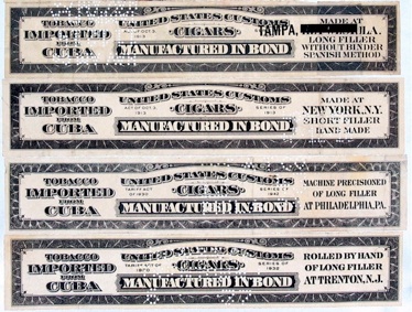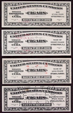 If you see a US Customs stamp prominently displayed on the top of a box it is usually not an import stamp. Instead, it certifies the cigars were made of Cuban tobacco in a bonded ware-house in Philadelphia, New Orleans, Tampa, New York, Key West or Trenton, NJ. They’re called “Manufactured in Bond stamps,” dated between 1913 and 1953, come in two sizes and are found with various text identifying the type of tobacco and whether hand or machine made.