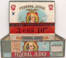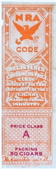 The orange stamp was another affirmation of support of the NRA, and was issued in a variety of forms and denominations. Few cigar boxes display both; most display the Blue Eagle inside, either printed or on a sticker.