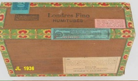 The strangest placement yet is that seen lower left: a small size 1936 stamp folded lengthwise and glued half on the front and half on the bottom. The Union “Blue Label” has (very rarely) also been found on the bottom and on the back of a cigar box, a placement which seems to defeat its purpose.