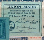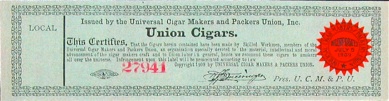 The Union label was furnished free to all strictly Union shops, to be placed on cigars made by Union members. If the manufacturer also bought and resold Chinese, tenement house, or scab cigars, it was up to the Local Union to decide whether to withhold the label. If the label is granted to such a firm, it may not be placed on any of the disapproved Chinese, scab or tenement house cigars. It was forbidden to use the label in any factory which paid less than $6 per thousand to its rollers, or on any cigars sold for less than $20 per thousand (2¢ each). No factory who offered any premium as an inducement for the sale of his goods could legally use the label. One of the more controversial, some say short-sighted, decisions by the C.M.I.U. prohibited the blue label to be used on cigars made in whole or in part by machinery (which at first included moulds). Although this dictum was modified later, it prevented bringing the huge new female work-force into the Union expeditiously, causing a substantial loss of momentum in the Union movement.
