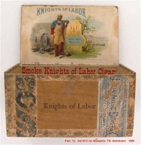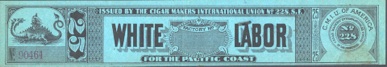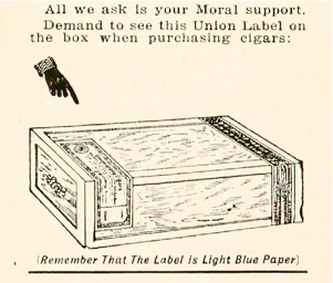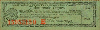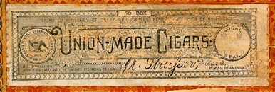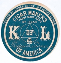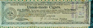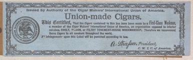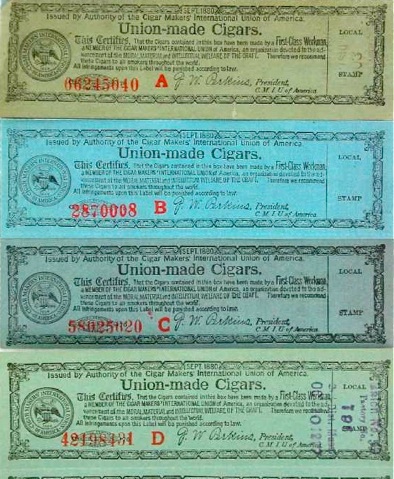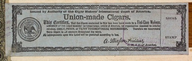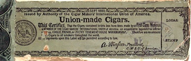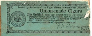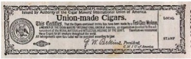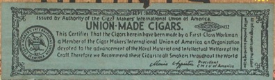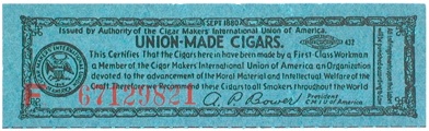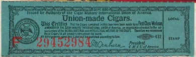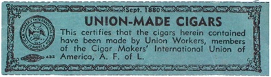 Founded in 1864, the Cigar Maker’s International Union is one of history’s most influential. Among its many contributions is the national label to identify Union made goods. Adopted at the 1880 convention, the label is blue as a compromise between San Francisco which issued an anti-Chinese white label in 1874 and St. Louis which issued a red label during a strike against a wage reduction in 1875.