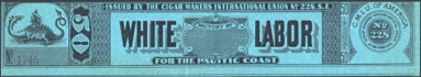 Two short lived CMIU stamps issued by San Francisco local 228 as part of their anti-Chinese campaign. The lower, blue, stamp is known to have been produced in different denomina- tions (25, 50 and 100) and has been found on a box of California cigars from that period. The top version is known only from a poster, though it appears to be multi-denominational.