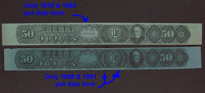EASY DATING begins with what you will find, the four very similar issues of 1878, 1883, 1898 and 1901. These four issues are on boxes of the Golden Age. The main difference between the four years of issue is the positioning of the date.