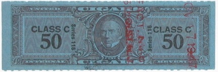 World War II caused a rise in tax and new stamp. Same size, but Clay’s portrait returns. Stamps are all same generic black on blue and first printed blank. The Tax Class, Series number and denomination were added as needed in a second press run, an inexpensive and efficient method.