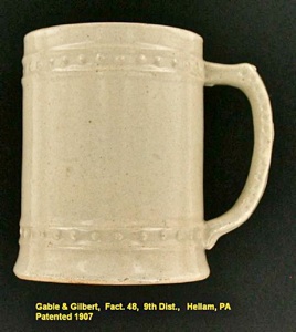 This plain clay-colored beer(?) mug was granted a patent in December of 1907. Used by cigarmakers Gable & Gilbert, Fact. 48, in the 9th Tax District, Hellam, PA. Customer