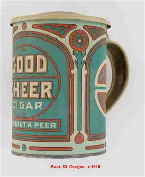 Less useful for drinking, but more decorative, is this c1912 tin can known to have been filled by at least two different cigar factories. This can was filled by D.C. Rose & Son, Factory 53 in Corvalis, Oregon.