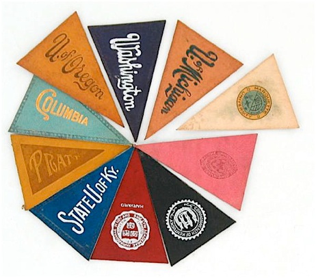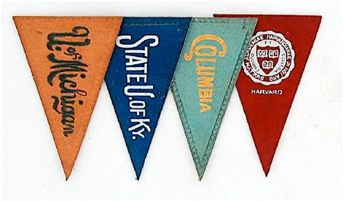 • A huge variety of college pennants exists as well, with 122 basic designs and large numbers of variants in size, printing, staffs, attached ribbons, embossing and the like. Whew!