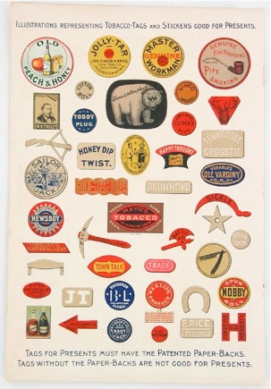 The first widely available premiums on the U.S. scene were tin tobacco tags. Like Susini’s cigarette wrappers in 1860’s Cuba, tin tags began as an attempt to thwart counterfeiting and grew into a popular collectible.