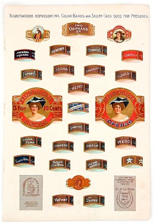 Center spread from the 1904 FLORADORA catalog showing the tobacco tags and cigar bands that would be accepted for redemption. Both the brands and the premium redemption company were acquired by the tobacco trust soon after and became part of United Cigar Stores redemption plan.