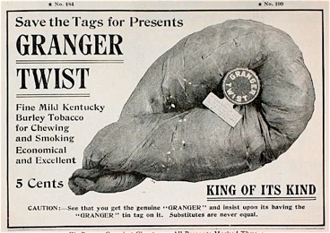 Twist was an old-fashioned, but still popular, method of preparing leaf for sale as chaw or pipe. It was difficult to tell one maker’s twist from another until the introduction of tin tags. Twist tags often had one long prong instead of two shorter ones used on plugs.