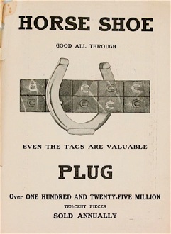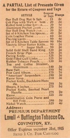 One of the accidental strokes of genius in marketing, tin tags remained popular for four decades, ultimately made obsolete in the 1920s when machines began wrapping one-ounce bricks of plug in printed cellophane. By that time, paper coupons had largely replaced tags for premium redemption; coupons never took the place of colorful tin tags in the hearts of collectors.