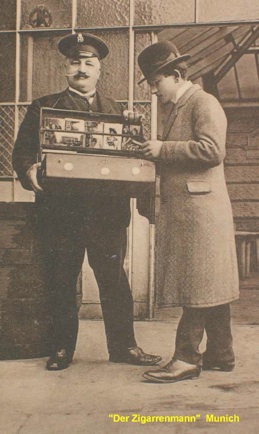 Pre World War One German postcard depicts a Munich street seller proudly offering postcards and cigars. Like the previous postcard (above), this too is captioned as the cigar seller, ‘Der Zigarrenmann,’ although he sells other items as well.