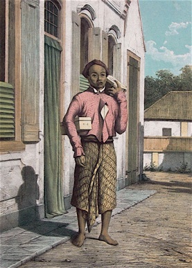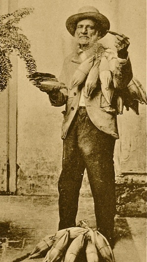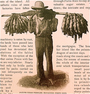 Center Left: Puerto Rican street cigar vendor offering yaguas from his shoulder yoke, as he walks the streets of Mayaguez, Puerto Rico c1900.