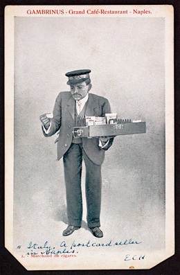 The young Englishwoman who sent the card refers to this Naples, Italy, vendor as “a postcard seller,” which he was also, but the illustration is captioned ‘Marchand de cigares.‘