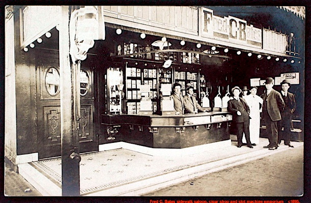 Though saloons were everywhere in the 1890’s I doubt if this streetside ability to grab a quick one and lose a paycheck was common even in that more permissive society. Fred C. Bates was the proud owner, city unknown. This over merchandising of booze helped lead to prohibition.