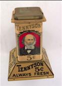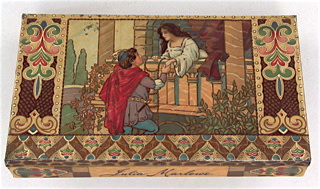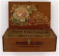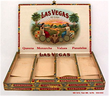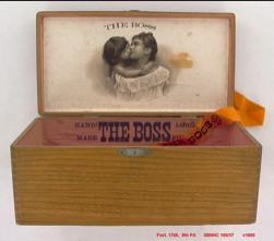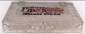 Five rows of five cigars was so logical a package that tin 25/up cans were more often square than round, though both are seen. Ad copy on both 25 and 50/ups was applied with paper labels or with the graphics lithographed directly onto the tin, the latter usually the more collectible. A display stand or glass display lid is a major plus. This display dates from the 1920’s.