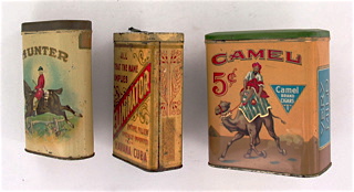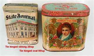 STATE JOURNAL is a 25/up hinged rectangle (some call oblong) with paper label along side a 50/up hinged oval. These tins date from 1910 to 1930. Post WWII use of tin declined in the face of cheaper cardboard boxes. DUTCH MASTERS (not pictured) is one of the few brands to make extensive use of tin after 1960.
