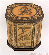 Upright cans were also made oval and rectangular and with hinged, slip top and vacuum lids. Pictured here are a 10/up oval slip top, 12/up rectangular slip top and a 25/up hinged rectangle, all litho on tin. Of these, the ELIMINATOR is the most rare brand and box shape.