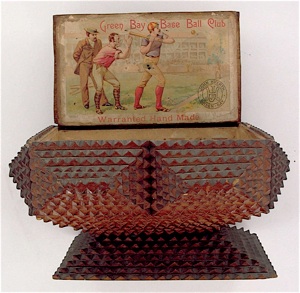 typically made by home woodworkers or prisoners, not hoboes. 1850 - 1950. This twin pyramid pedestal was built on a nailed wood 50/13 cigar box honoring the Green Bay, Wisconsin, baseball team around 1890. SOLD