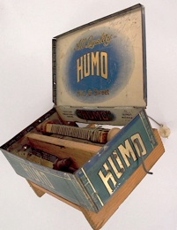 An inventive cigar box recycle is this ice fishing rig built into a common HUMO tin 50/13 box from the 1920s. Includes supports, a crank reel, tackle, storage...